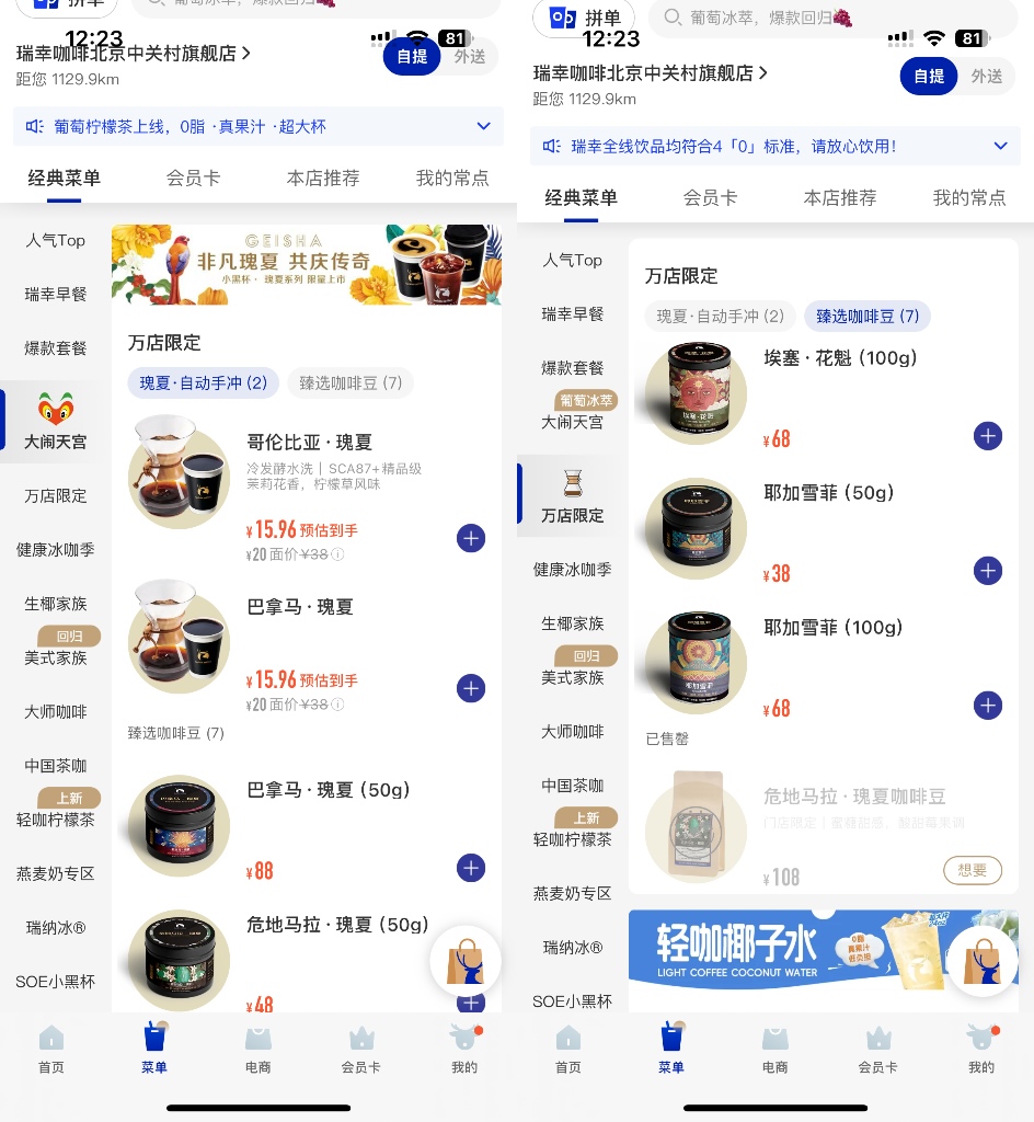 從菜單看,該店產(chǎn)品除了生椰拿鐵、橙C美式等常規(guī)品類外,還有上線了“萬店限定”系列,包括三款手沖咖啡,分別是哥倫比亞·瑰夏、巴拿馬·瑰夏、危地馬拉·瑰夏,以及8款臻選咖啡豆。其中,手沖咖啡的危地馬拉·瑰夏咖啡豆已經(jīng)售罄。