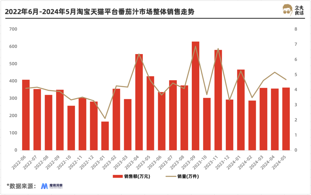 2022年6月-2024年5月淘天番茄汁市場整體銷售走勢