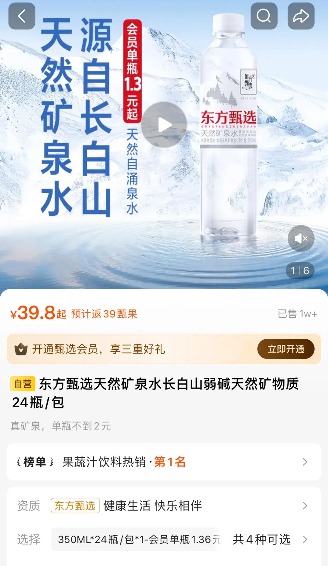 而剛剛推出的東方甄選礦泉水,目前已在東方甄選APP平臺上架,優(yōu)惠后的價格為39.8元/包(350毫升*24瓶)和45.41元/包(500毫升*24瓶),確如官方所述,每瓶到家價格均控制在兩元以內(nèi)。