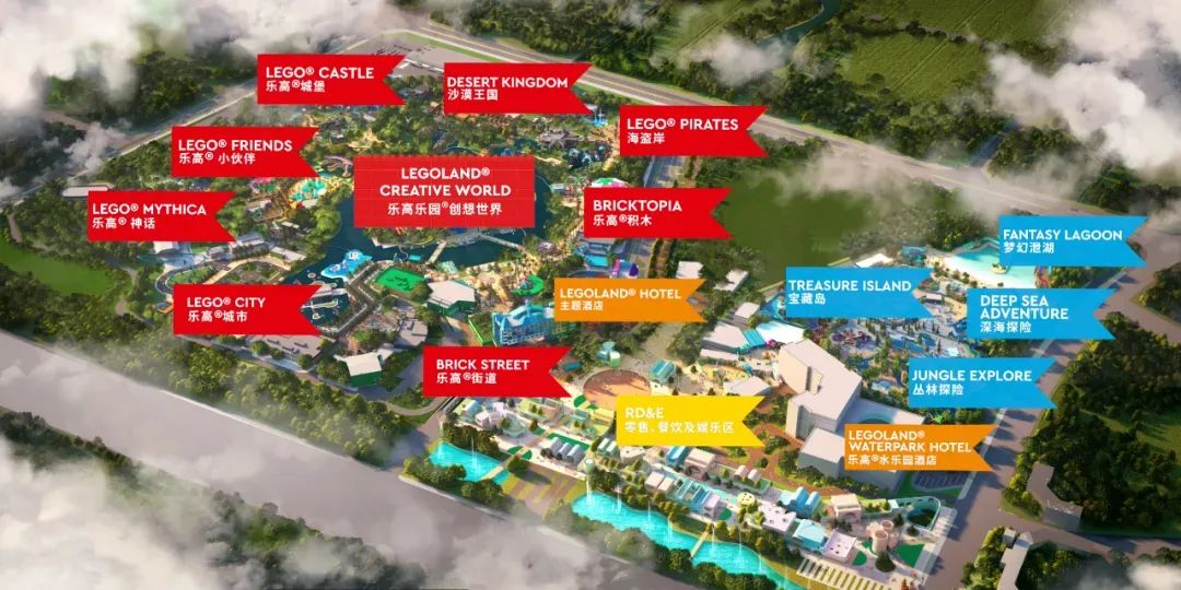 其中樂高樂園主題樂園將設有樂高街道、樂高積木、樂高樂園創(chuàng)想世界、樂高城市、樂高小伙伴、樂高神話、海盜岸、沙漠王國、樂高城堡9個主題板塊。而樂高樂園水上樂園則由夢幻泄湖、深海探險、寶藏島、叢林探險4大主題區(qū)組成,主題樂園和水樂園共計擁有約100種互動游樂設施、表演和景點。