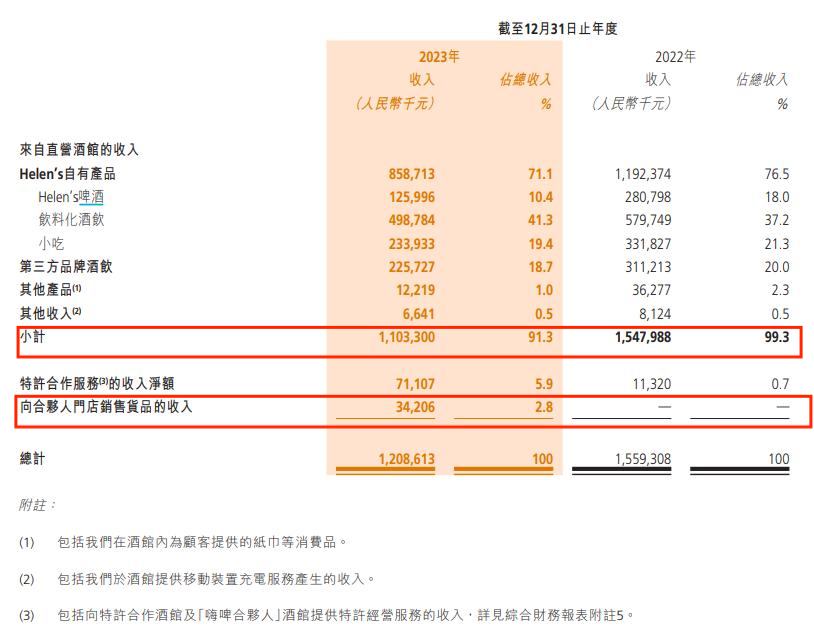令人玩味的是,盡管大力發(fā)展合伙人門店網(wǎng)絡(luò)被海倫司考慮為收入減少的因素之一,但從2023年年報(bào)中不難看到,在直營酒館收入較去年下降4.45億元的同時(shí),海倫司向合伙人門店銷售貨品為其增收了3420.6萬元。