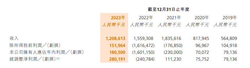 受到疫情等因素影響,2021年與2022年,該公司分別凈虧損2.3億元及16.01億元,累計(jì)虧損18.31億元;同期,經(jīng)調(diào)整凈利潤分別為1.11億元及-2.4億元。