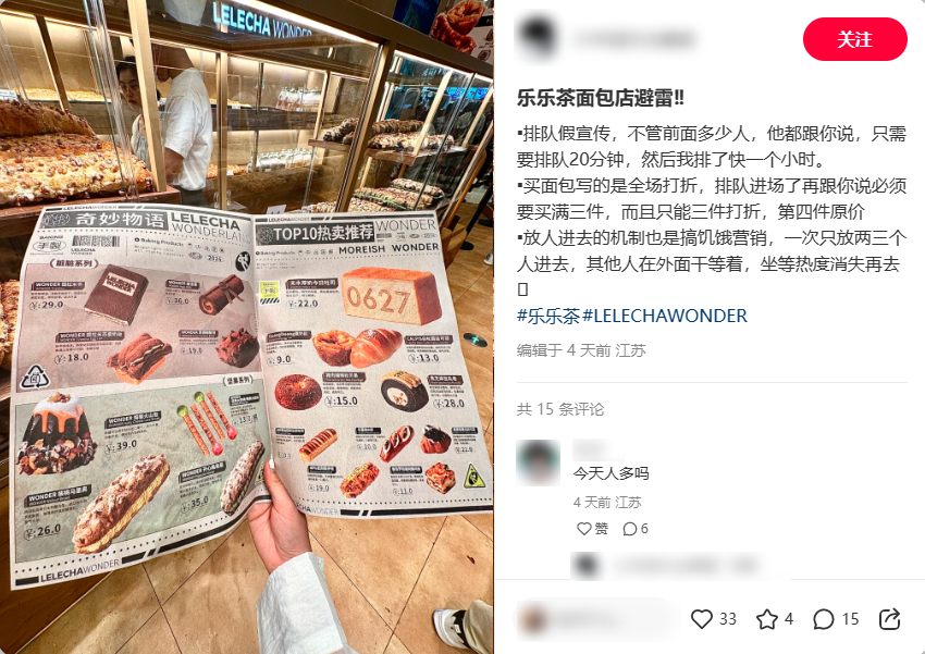 最近開(kāi)店的樂(lè)樂(lè)茶烘焙,現(xiàn)制現(xiàn)烤的品質(zhì)追求與異;鸨幕顒(dòng)現(xiàn)場(chǎng)形成了錯(cuò)位,有顧客排隊(duì)后買(mǎi)不到海報(bào)廣告上的產(chǎn)品,反而對(duì)樂(lè)樂(lè)茶留下了不好的印象。部分顧客表示其產(chǎn)品在口味上也有不少需要升級(jí)的地方。