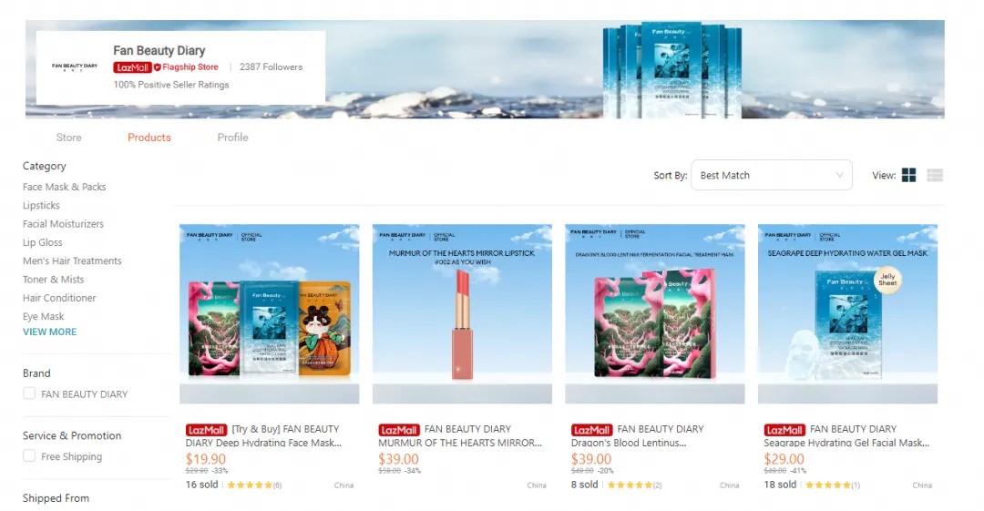 截至7月11日,在Lazada搜索FAN BEAUTY,顯示其在新加坡和馬來西亞都已經(jīng)開出了旗艦店,上架了面膜、洗護產(chǎn)品和彩妝等品類共32件商品。