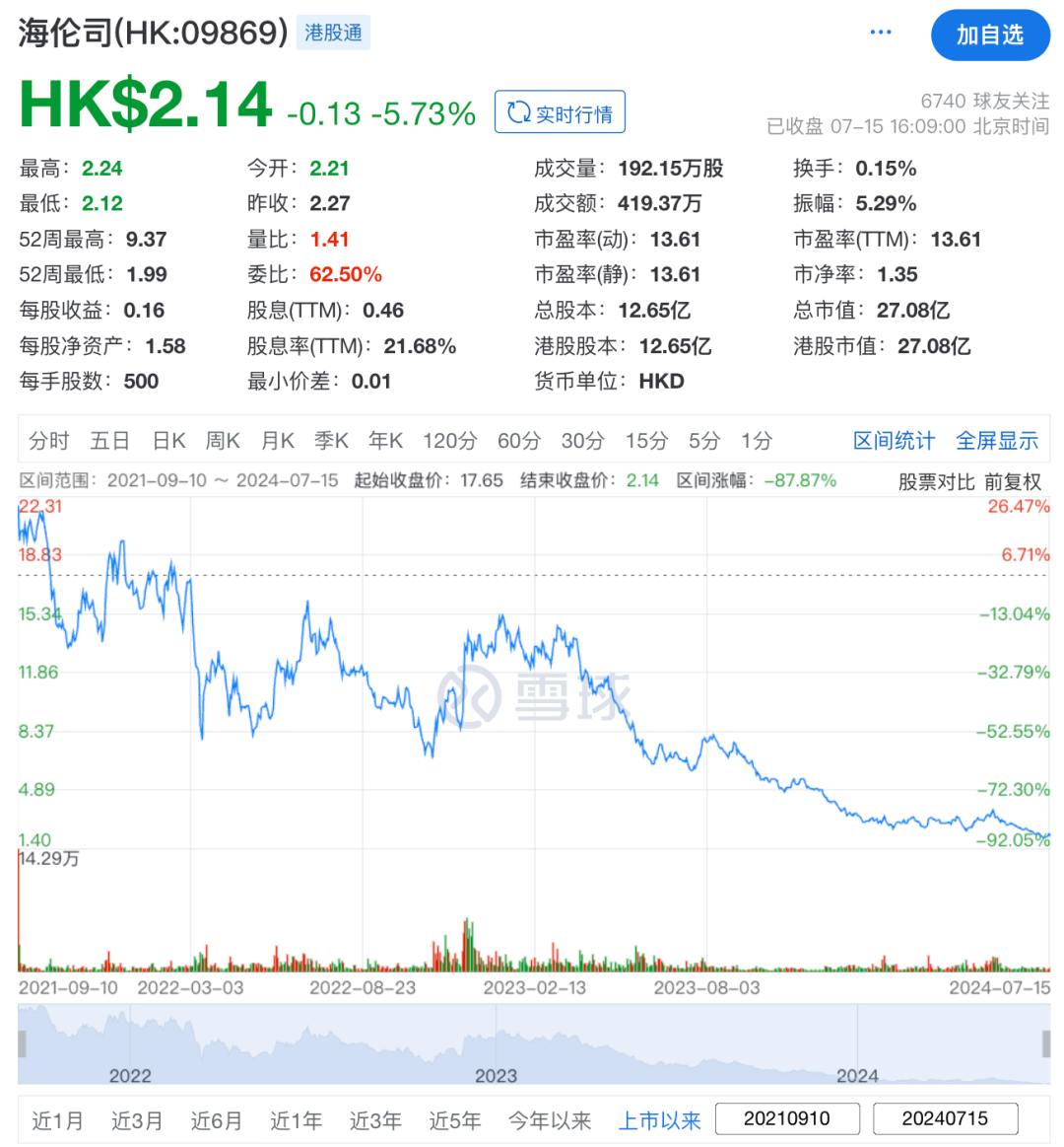 業(yè)績下滑引發(fā)資本市場的憂慮,300億市值“曇花一現(xiàn)”后,海倫司股價持續(xù)走低,三年內(nèi)市值蒸發(fā)約270億港元。
