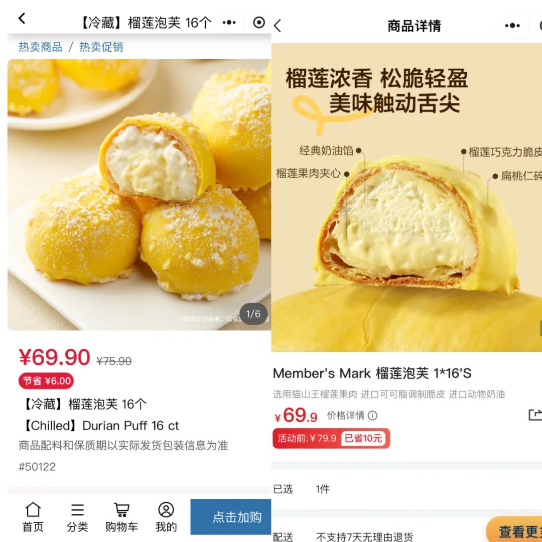 開市客(左)和山姆(右)都推出了“榴蓮泡芙”,價(jià)格規(guī)格相同 圖源:小程序截圖