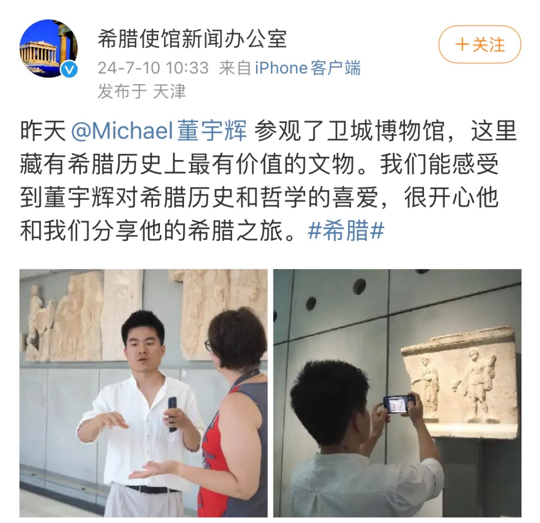 另外,董宇輝還邁向了國(guó)際。最近,董宇輝被拍到現(xiàn)身希臘,疑似在錄制節(jié)目。董宇輝還在抖音平臺(tái)上自己發(fā)布了視頻,背景正是雅典衛(wèi)城。就連希臘使館新聞辦公室也發(fā)布了一條關(guān)于董宇輝的微博。
