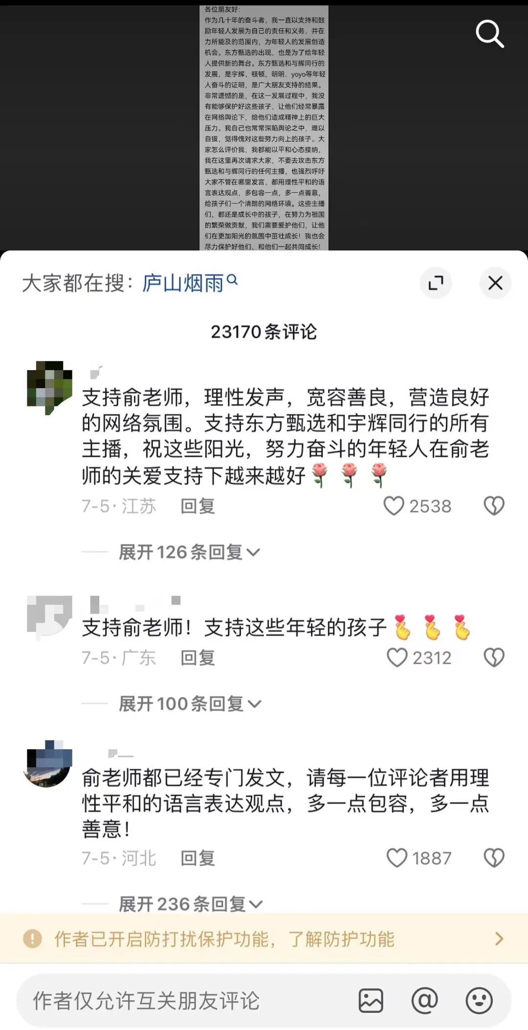 后續(xù)俞敏洪還發(fā)布長(zhǎng)文呼吁網(wǎng)友“不要攻擊方甄選和與輝同行的任何主播”。