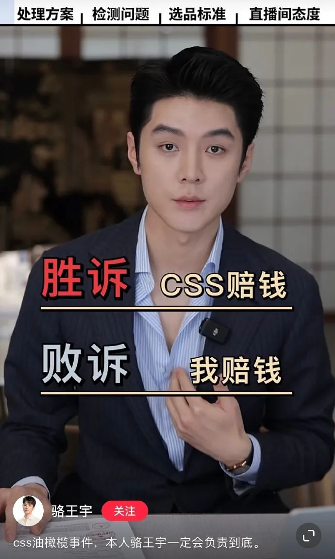 駱王宇在視頻中表示,所有在他直播和櫥窗賬號,購買了CSS油橄欖精華的用戶,都會由他出錢全額退款。