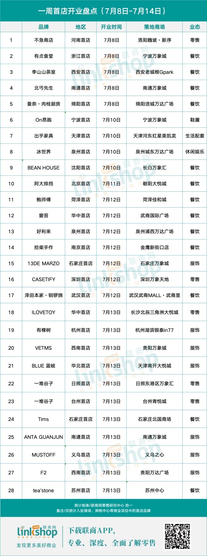 最近又有哪些城市首店開業(yè)?據(jù)聯(lián)商網(wǎng)研究中心不完全盤點,上周(7月8日-7月14日)共有28家首店開業(yè),其中餐飲品牌13家,服飾品牌7家,零售品牌5家,鞋履品牌1家,生活配套品牌1家,休閑娛樂品牌1家。