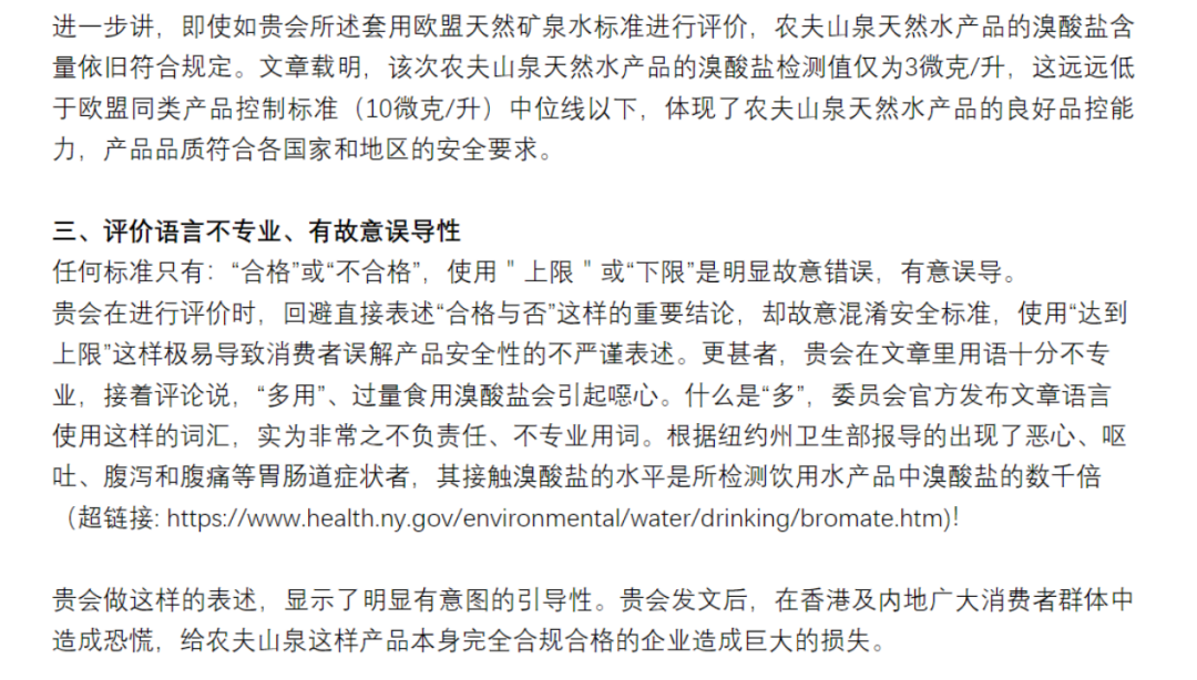 所以事實(shí)是,被檢測每升3微克溴酸鹽的農(nóng)夫山泉天然水,不僅完全符合歐盟天然水標(biāo)準(zhǔn),而且離“上限”還遠(yuǎn)著呢。