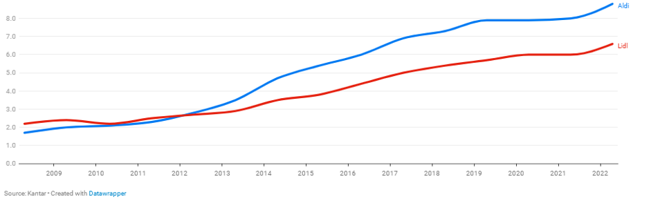 上面這張圖,展示了ALDI及其追隨者LIDL,在英國食品雜貨零售業(yè)的市場占有率爬升的過程。緩慢然而堅定。