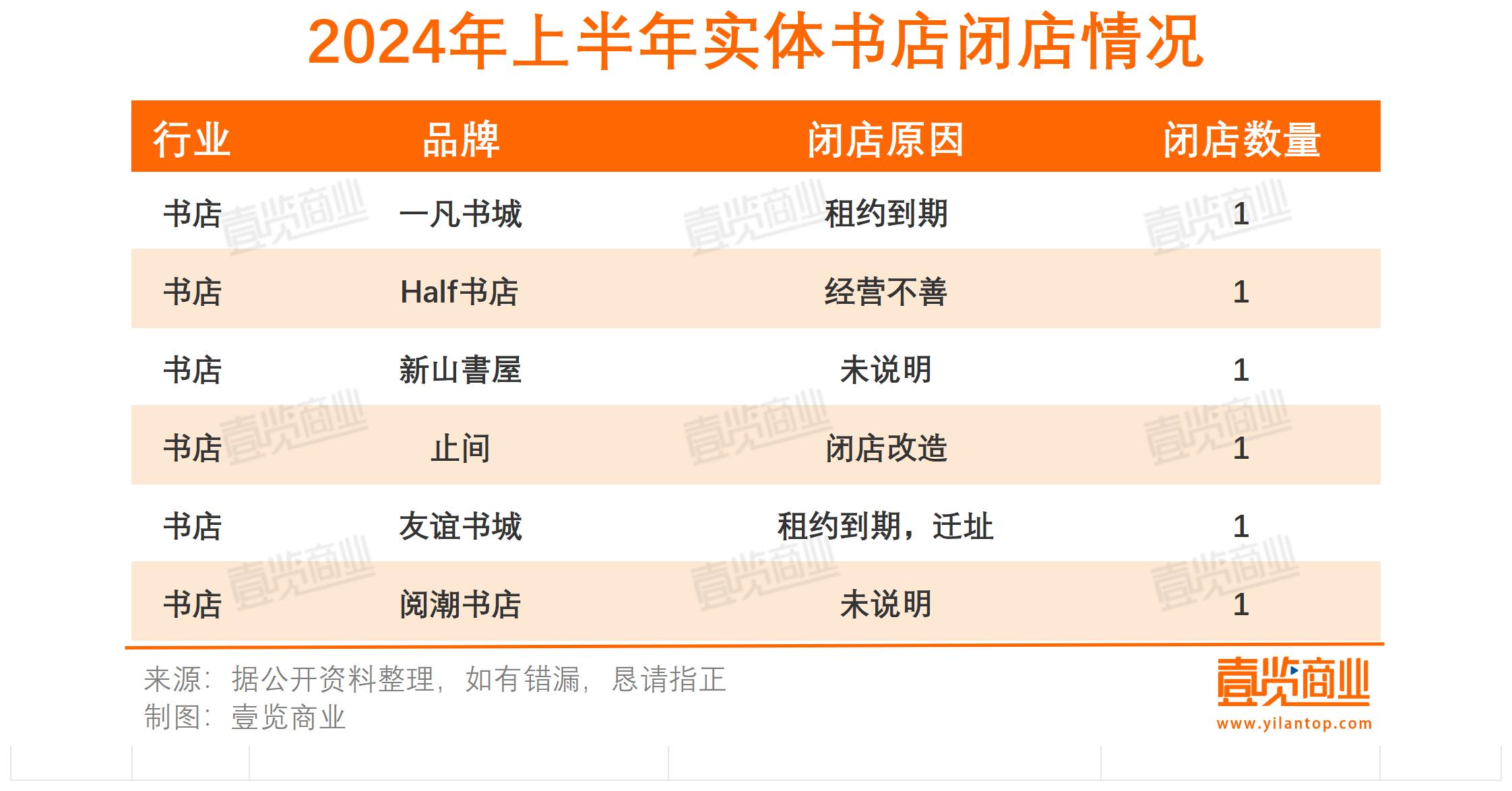 據(jù)壹覽商業(yè)不完全統(tǒng)計,2024年上半年,至少有4家書店關(guān)閉,1家書店閉店改造,1家書店閉店遷址。此外,網(wǎng)紅書店十點書店也宣布7月將關(guān)閉旗下所有門店,退出實體書店行業(yè)。