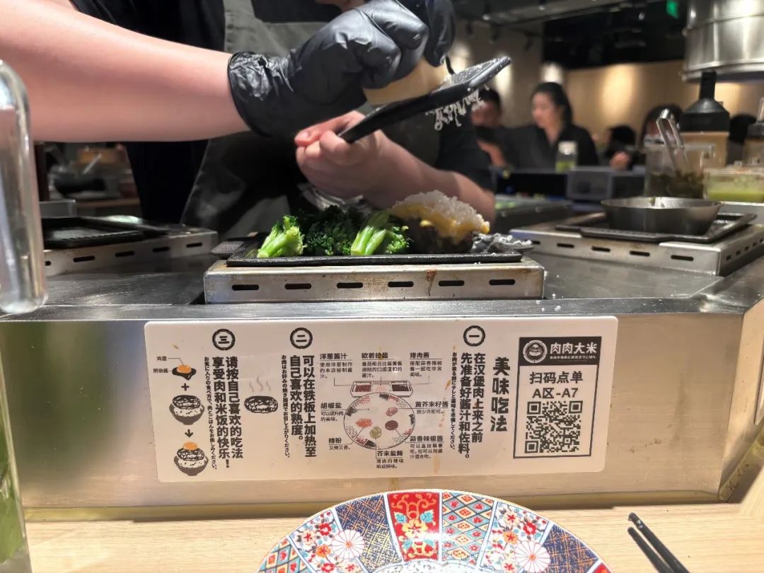 第三是顧客體驗上,在排隊的過程中,給與排隊時間的指引,并可提前掃碼點單,離隊首越近,越能直觀的看到現(xiàn)場烹飪的動作和香氣。坐席上會有具體吃法的介紹,也可與店員進(jìn)行互動。米飯、西蘭花、和味增湯可以無限補(bǔ)充。