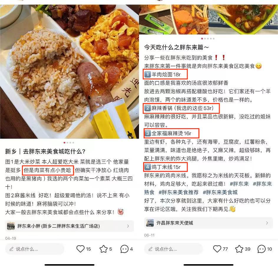 就連“頂流”胖東來也并未選擇涉足“平價食堂”,胖東來美食城不同于永輝社區(qū)食堂、物美大食堂,前者更注重餐品種類的多樣性,推出的餐品也以各色小吃為主,從消費者分享的信息來看,相比以物美為代表的平價食堂,胖東來餐飲也不走“卷低價”路子。