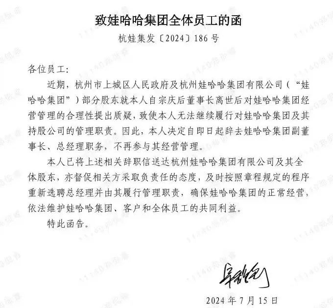 函件內(nèi)容顯示,由于杭州市上城區(qū)人民政府及娃哈哈集團(tuán)部分股東對管理的合理性提出質(zhì)疑,導(dǎo)致管理推進(jìn)困難,宗馥莉決定辭去娃哈哈集團(tuán)副董事長、總經(jīng)理職務(wù),不再參與經(jīng)營管理。函件署名為“宗馥莉”,落款時(shí)間是7月15日。
