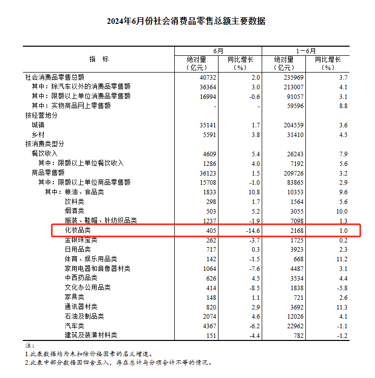 7月15日那天,一張數(shù)據(jù)截圖在朋友圈刷屏,是國家統(tǒng)計局發(fā)布的今年上半年社會消費品零售總額數(shù)據(jù),上面顯示,化妝品類在今年6月同比下降了14.6%,整個上半年僅上升1%。