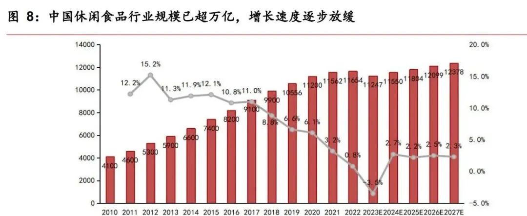當前休閑食品行業(yè)規(guī)模呈現(xiàn)出長期穩(wěn)定增長的態(tài)勢,iiMedia Research(艾媒咨詢)調(diào)查測算顯示,近十年來我國休閑食品行業(yè)市場規(guī)模持續(xù)增長,從 4100 億元增長至 11654 億元,預(yù)計 2027 年中國休閑食品行業(yè)市場規(guī)模將達到 12378 億元,休閑零食將由快速增量市場轉(zhuǎn)向微增市場。