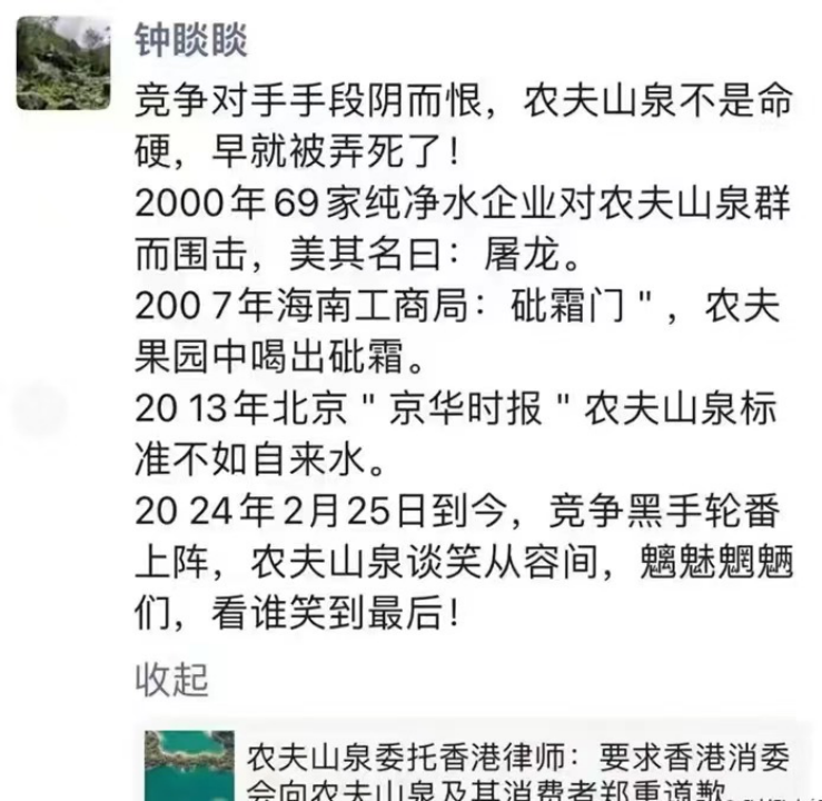7月18日,鐘睒睒就此事在社交平臺(tái)表示,“競(jìng)爭(zhēng)對(duì)手手段陰而恨(狠?),農(nóng)夫山泉不是命硬,早就被弄死了。“