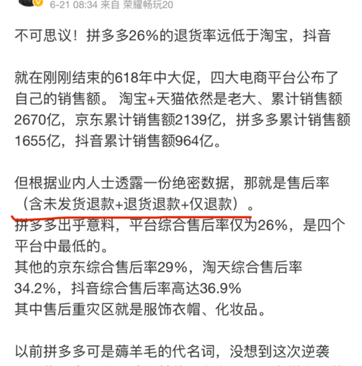 從今年618的售后數(shù)據(jù)看,“僅退款”的影響也沒(méi)有想象的那么大,比如被“圍攻”的拼多多,作為最早推出“僅退款”的平臺(tái),在售后服務(wù)方面表現(xiàn)得反而更好。