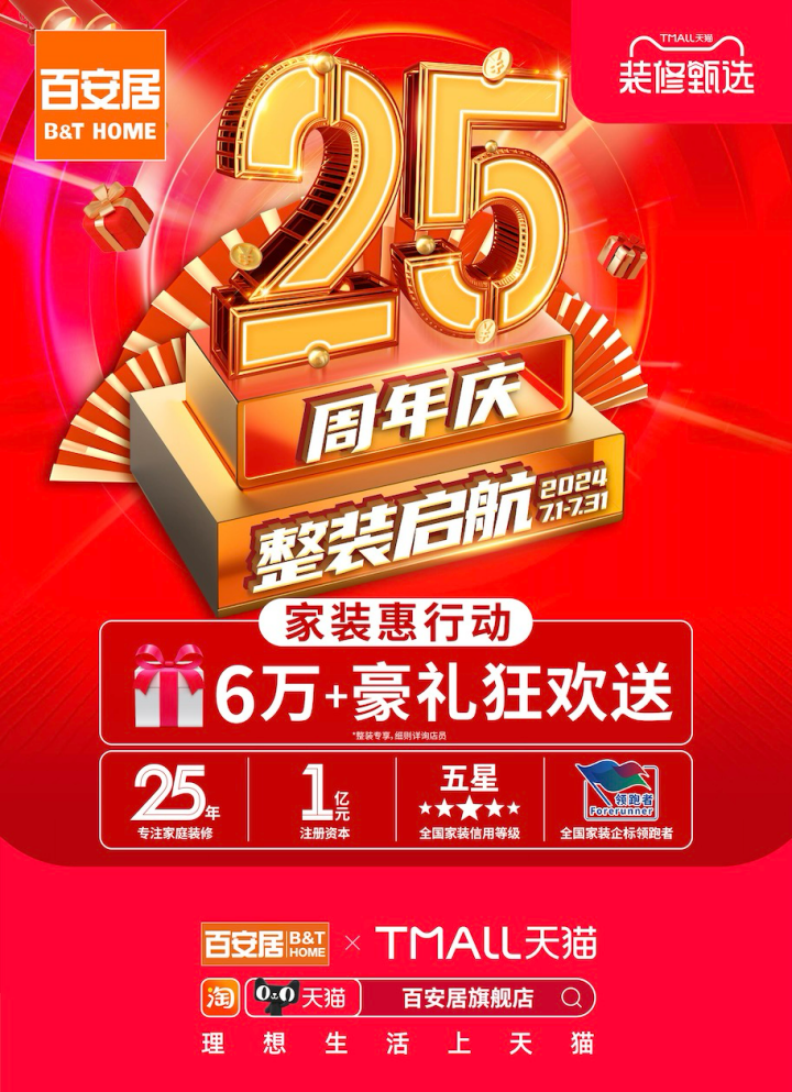深耕中國市場25年,百安居見證了無數(shù)家庭的幸福。此次25周年慶活動不僅是對過往成就的慶祝,更是對未來的展望與承諾。針對當(dāng)前消費(fèi)者對家裝便捷性和性價比的雙重需求,百安居通過整合優(yōu)質(zhì)資源,為消費(fèi)者提供從設(shè)計、選材到施工、售后的全流程解決方案,確保價格透明、無增項(xiàng)的整裝體驗(yàn),不斷刷新行業(yè)服務(wù)標(biāo)準(zhǔn),提升家裝消費(fèi)體驗(yàn)。通過持續(xù)的創(chuàng)新與改進(jìn),百安居正在將“整裝”打造成業(yè)績增長的新引擎,為消費(fèi)者帶來更極致的產(chǎn)品和服務(wù)體驗(yàn),推動家裝家居行業(yè)邁向高質(zhì)量發(fā)展的新階段。周年慶期間,簽約百安居整裝,可享受6萬+豪禮狂歡送等福利,助力消費(fèi)者省心、省力、省錢地打造夢想之家。