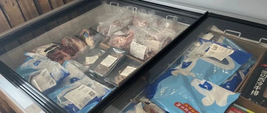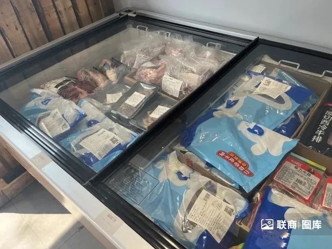 首先,商品豐富度不夠。盡管定位為社區(qū)生鮮店,但店內(nèi)生鮮品類占比偏小,唯一的冷藏柜中也是以水果為主,鮮肉、蔬菜等寥寥無幾。店內(nèi)主要售賣牛奶雞蛋、米面糧油等常溫食品,以及冷凍牛羊肉、預制菜、丸子等冷凍食品。