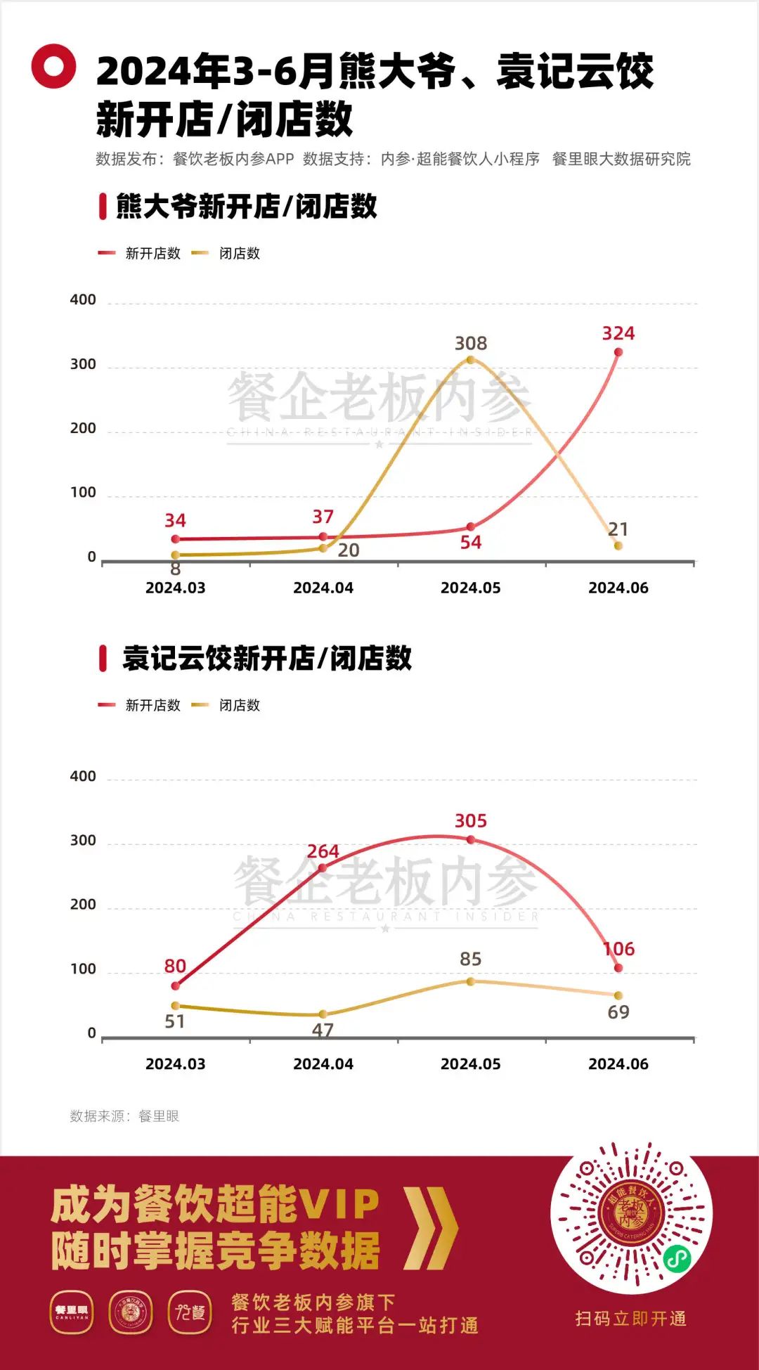 餐里眼數(shù)據(jù)顯示:袁記云餃在6月份開(kāi)店數(shù)量為106家,閉店數(shù)量達(dá)到了69家。而熊大爺?shù)臄?shù)據(jù)更不尋常,在今年5月份,顯示閉店數(shù)高達(dá)308家,雖然在6月份迅速回落,但仍舊可以窺見(jiàn)現(xiàn)包餃子加盟門(mén)店的不確定性之高。
