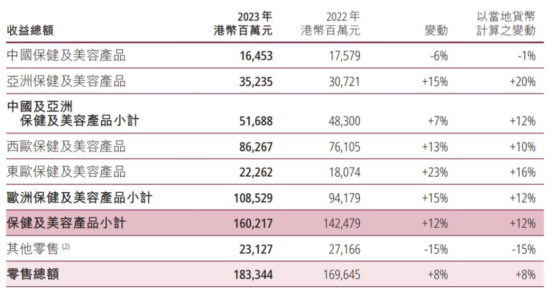今年3月,屈臣氏母公司長江和記發(fā)布了2023年年報,當(dāng)中提到,目前屈臣氏在全球28個國家經(jīng)營16500間門店,并擁有12個零售品牌;去年收入1833.4億元,按年度增長為8%,全球收益漸漸回暖。