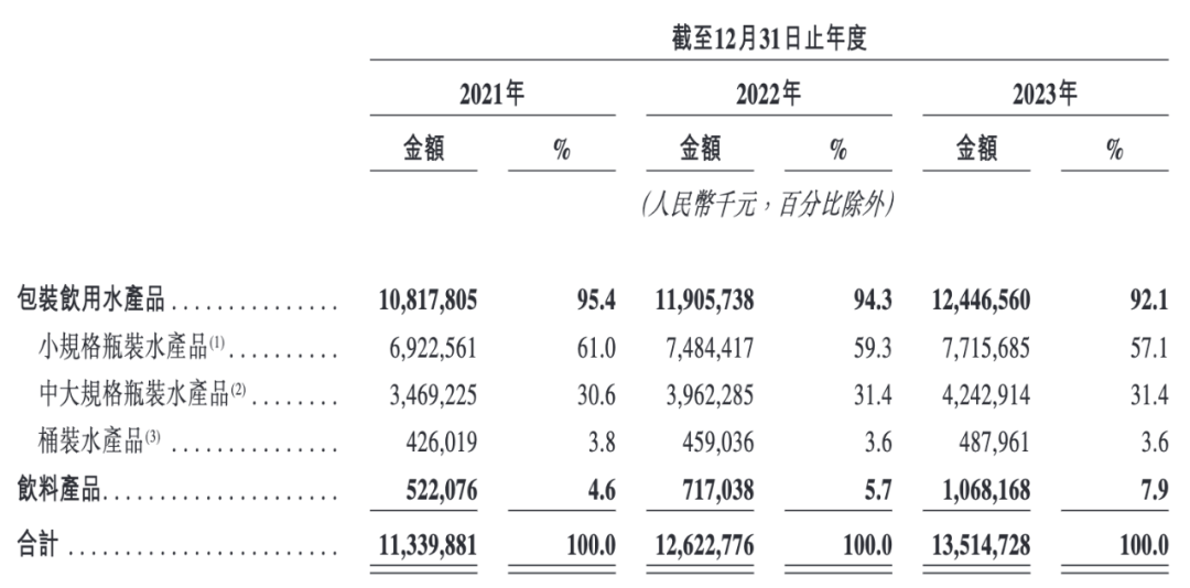 氫消費查詢華潤飲料招股書了解到,2021-2023年,其包裝飲用水產品分別產生收入108.18億元、119.06億元及124.47億元,分別占當期總收入的95.4%、94.3%及92.1%。
