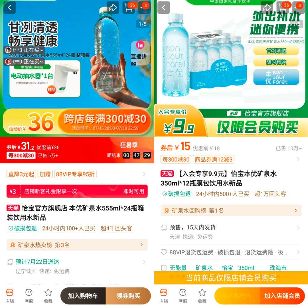 另一條鏈接下的本優(yōu)款泉水555ml*24瓶裝活動價僅售36元,券后價更是低至31.2元,比同樣容量的怡寶純凈水還便宜3元,折算下來單瓶售價為1.3元。該款產品已有3萬+人付款,在礦泉水熱賣榜上位列第三名,前兩名分別是泉陽泉和依云。