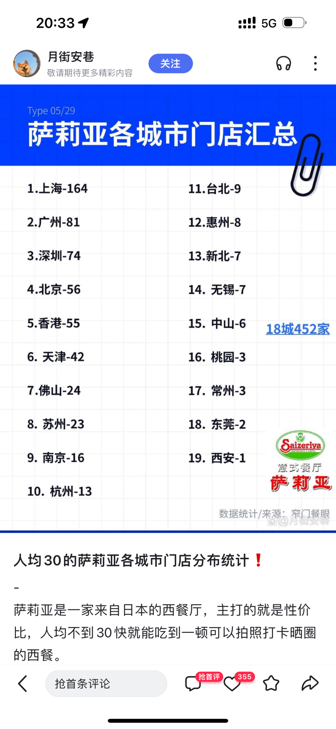 就是有名的意大利“沙縣”、日系連鎖餐飲品牌薩莉亞。12元的披薩,14元的意面,常年低價策略,讓薩莉亞收獲了一群忠實的粉絲,并在網(wǎng)上以“薩門”自居。