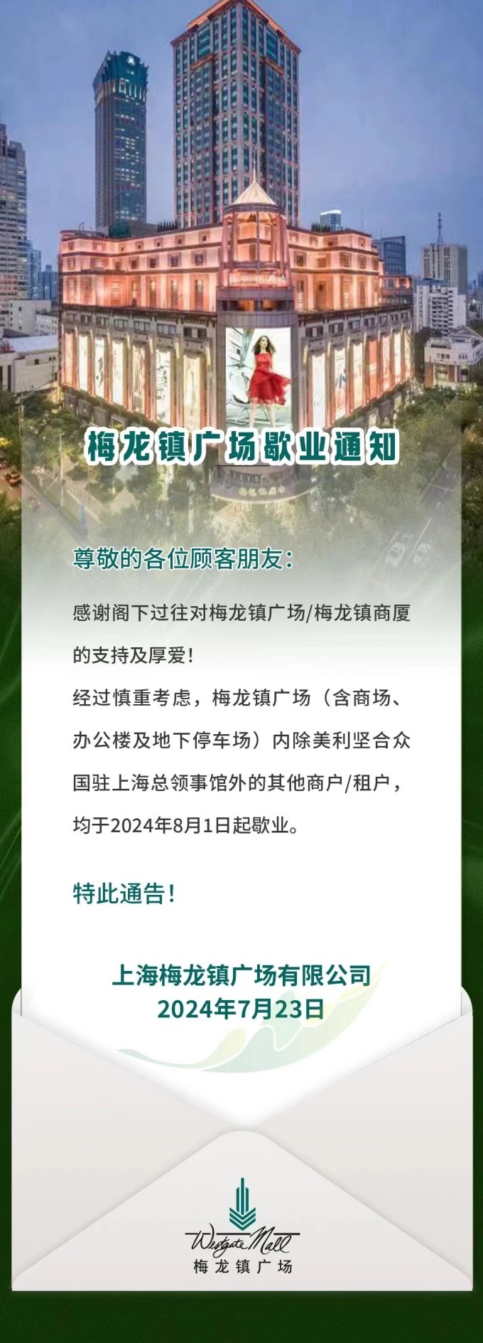 聯(lián)商快訊:7月23日,上海梅龍鎮(zhèn)廣場發(fā)布了歇業(yè)通知。
