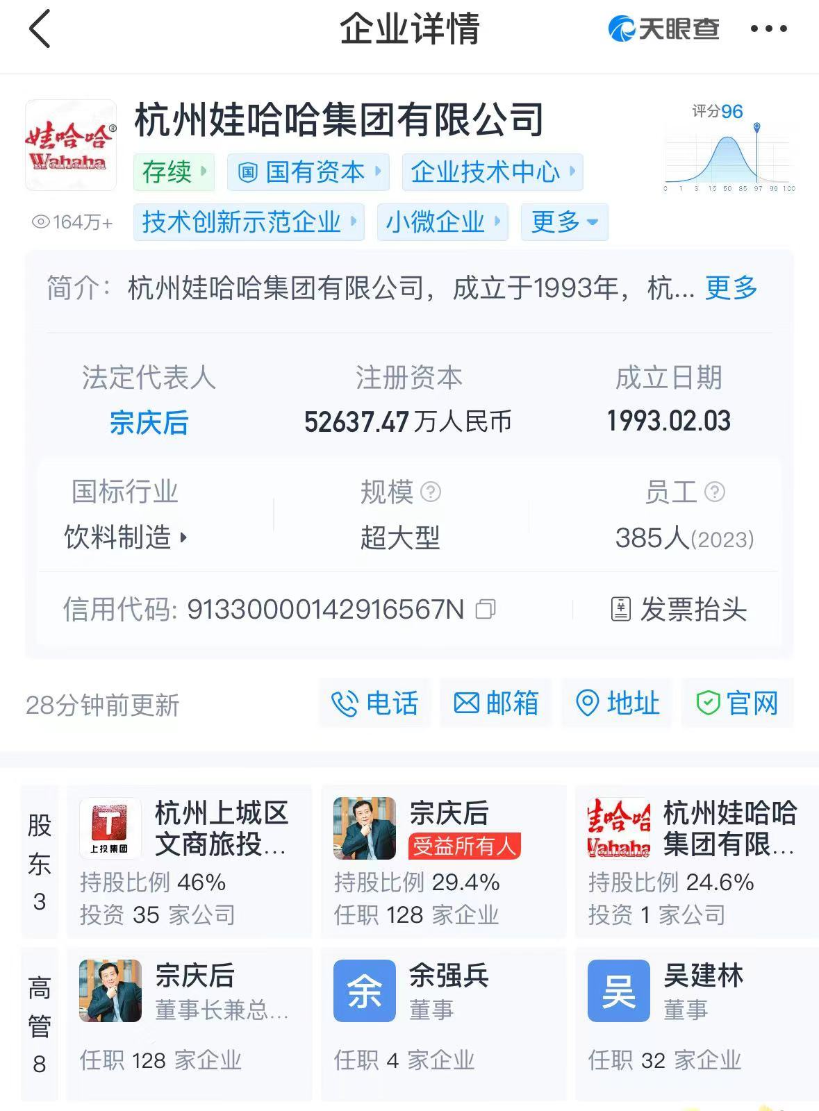 天眼查APP顯示,股東層面包括杭州上城區(qū)文旅投資控股集團(tuán)有限公司、宗慶后,以及杭州娃哈哈集團(tuán)有限公司基層工會(huì)聯(lián)合委員會(huì)(職工持股會(huì))。娃哈哈集團(tuán)的董事會(huì)包括5名成員,分別為宗慶后、張暉、吳建林、潘家杰,余強(qiáng)兵。