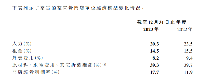 天風(fēng)證券財(cái)報(bào)顯示,2023年,奈雪單店經(jīng)營(yíng)利潤(rùn)率為17.7%,同比增長(zhǎng)了5.8%;原材料、水電、其他折攤占比為39.3%,同比下降了0.4%;人力占比為20.3%同比下降3.2%;租金占比同比下降1.0%;外賣(mài)費(fèi)用占比下降了1.2%。