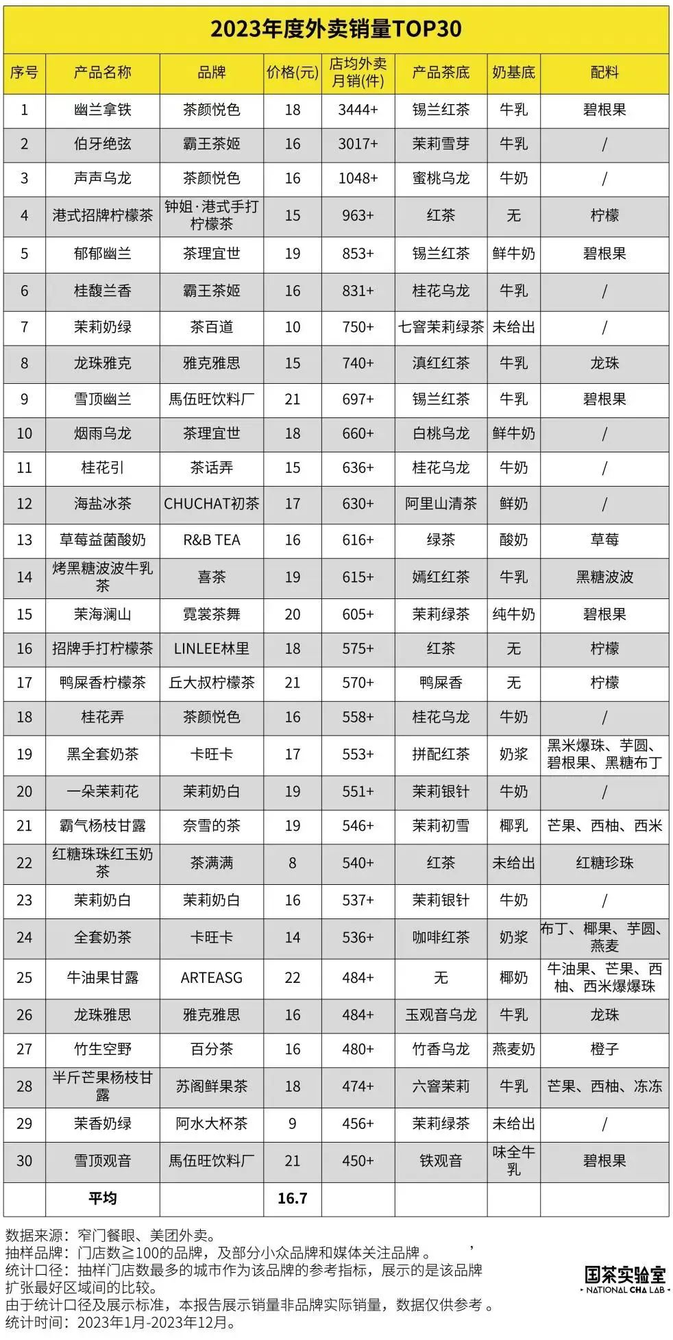 根據(jù)窄門(mén)餐眼與美團(tuán)外賣(mài)的數(shù)據(jù)顯示,2023年全年店均外賣(mài)月銷(xiāo)第一的產(chǎn)品是茶顏悅色的“幽蘭拿鐵”,第二是霸王茶姬的“伯牙絕弦”,第三是自茶顏悅色的“聲聲烏龍”。而這張TOP30的表格中,僅有一款奈雪的“茶”。