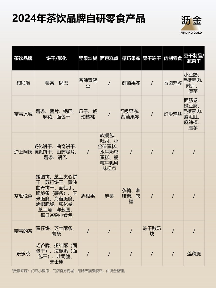 瀝金對幾大茶飲品牌2024年仍在售的小零食進行了統(tǒng)計,發(fā)現(xiàn)了茶飲品牌做零食的三大特征。