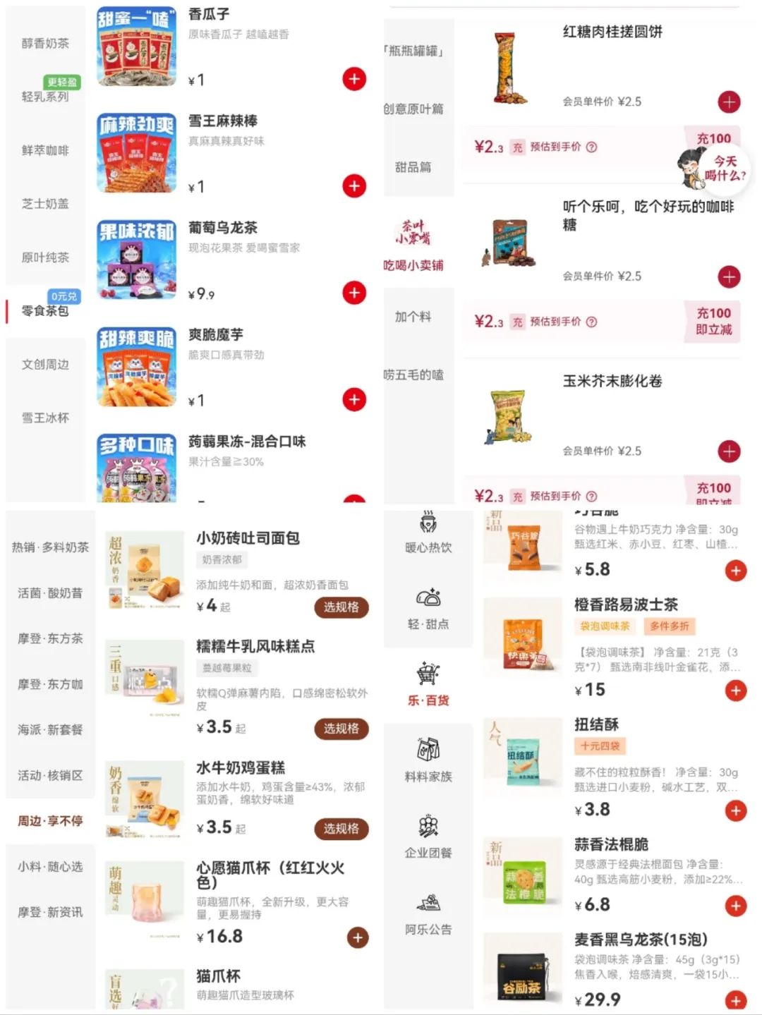 蜜雪冰城打出1元口袋裝,茶顏悅色推出2.5元零食專區(qū)。幾乎所有品牌都選擇了同一打法,線上點單的零食都為最小規(guī)格裝,普遍在20g-50g,對應(yīng)價格在1-5元。
