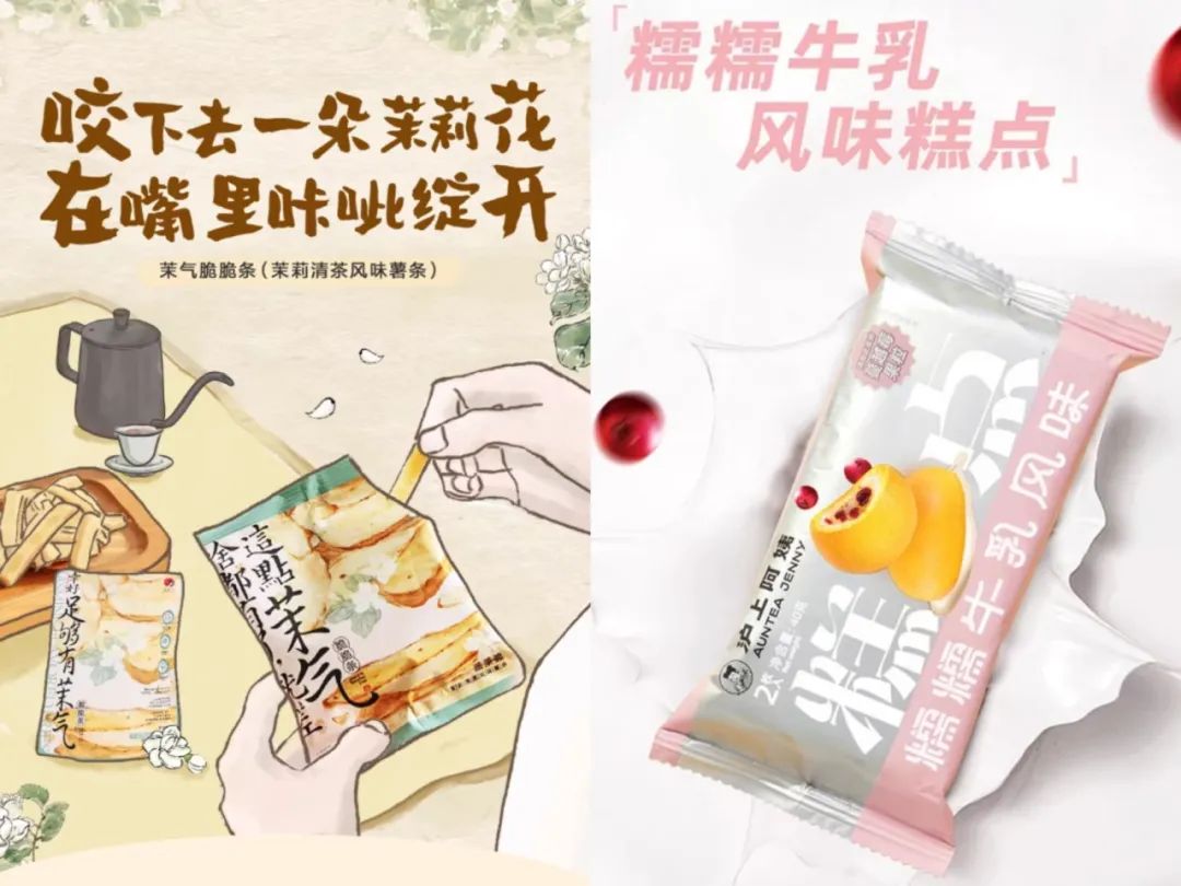 而中高端品牌則押注餅干/膨化食品,餅干、薯條是基底,玩轉(zhuǎn)風(fēng)味、創(chuàng)新品名才有差異化。