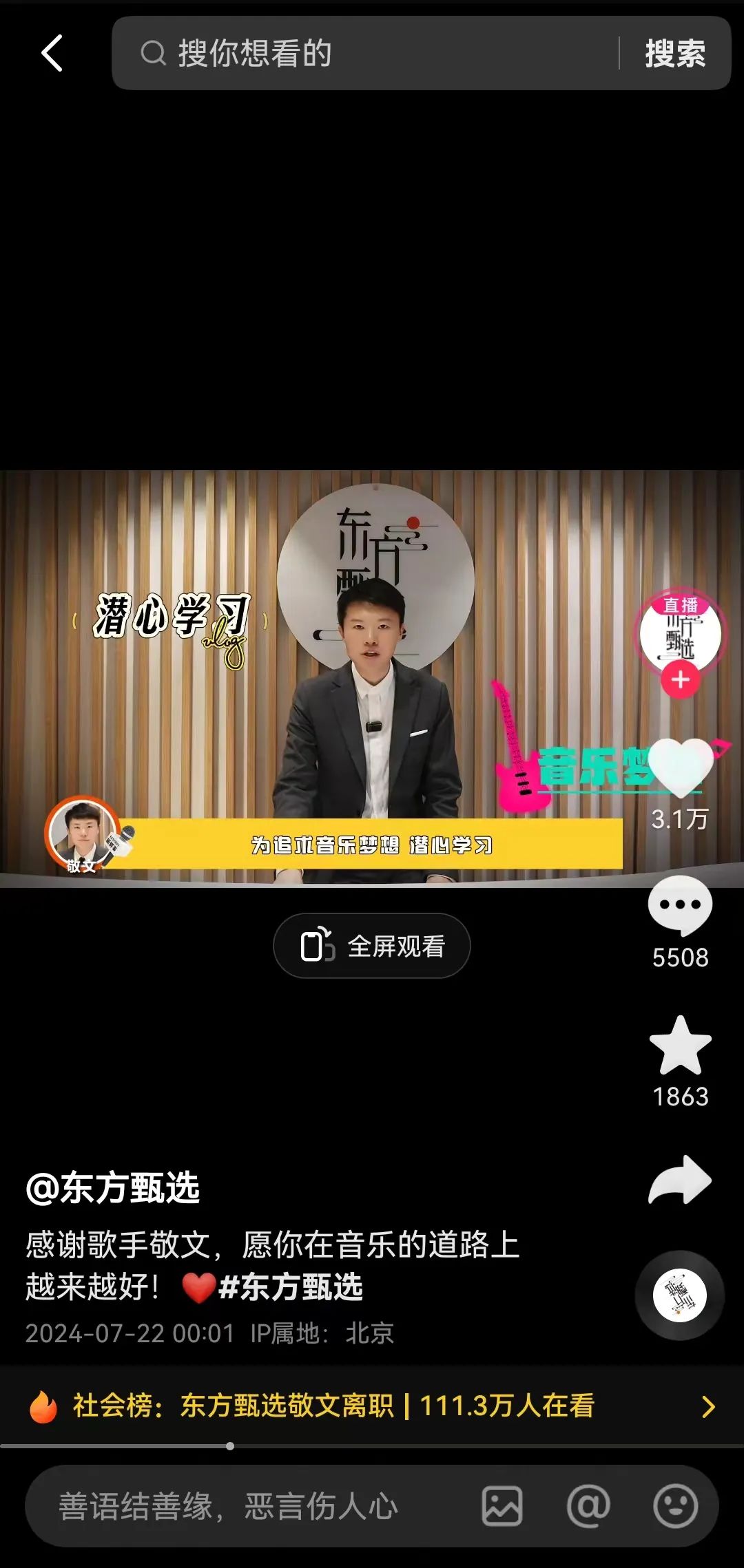 7月22日凌晨,東方甄選抖音官方號發(fā)布了一則視頻。該視頻主要是宣布主播敬文要離職了,他將在7月24日正式和大家告別。