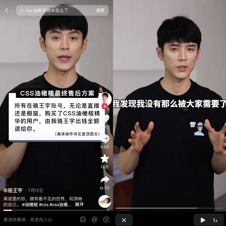 事情起因是駱王宇帶貨的一款“CSS油橄欖精華”被爆出實(shí)際檢測(cè)中沒有備案中提到的橄欖苦苷和羥基酪醇這兩種成分,因此產(chǎn)品功效以及合法性存疑。風(fēng)波出現(xiàn)后,品牌方遲遲不愿退款,最終駱王宇決定與機(jī)構(gòu)共同承擔(dān)1.5億元的商品退款。