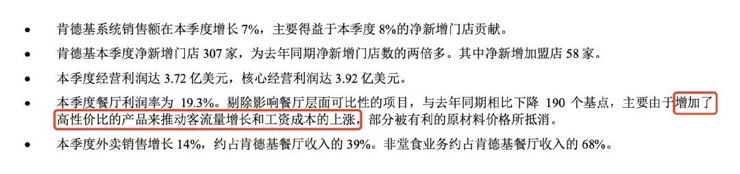 百勝中國2024 年第一季度財務業(yè)績報告顯示,肯德基的餐廳利潤率為19.3%,同比下降1.9個百分點。報告還特別提到,下降的原因是增加了高性價比產(chǎn)品,例如肯德基版本的“窮鬼套餐”——OK三件套,黃金SPA雞排堡+中薯條+可樂,只要19.9元。