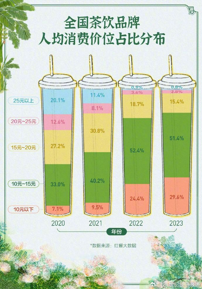 據(jù)紅餐大數(shù)據(jù),從2020年到2023年,新茶飲品牌10元以下消費(fèi)占比從7.1%上升至29.6%,20元以上占比則從32.7%下降至3.6%,曾飽受爭(zhēng)議的“奶茶30元時(shí)代”似乎已成過去。