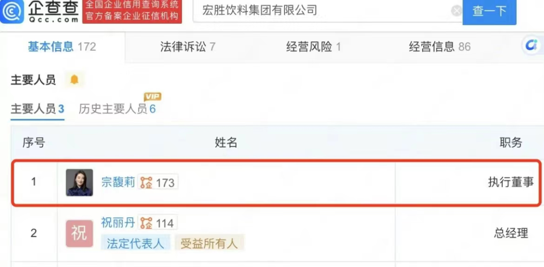 目前宗馥莉名下關(guān)聯(lián)企業(yè)有170余家,其中160余家為存續(xù)狀態(tài),擔(dān)任法定代表人的企業(yè)有37家,擔(dān)任股東的企業(yè)有15家。