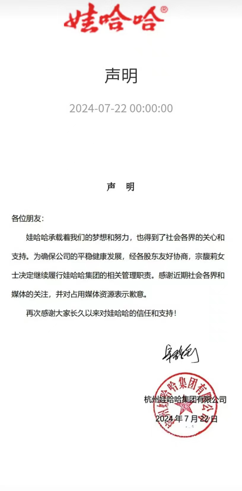 風(fēng)向一轉(zhuǎn),7月22日晚,娃哈哈發(fā)布聲明稱:為確保公司的平穩(wěn)健康發(fā)展,經(jīng)各股東友好協(xié)商,宗馥莉女士決定繼續(xù)履行娃哈哈集團(tuán)的相關(guān)管理職責(zé)。
