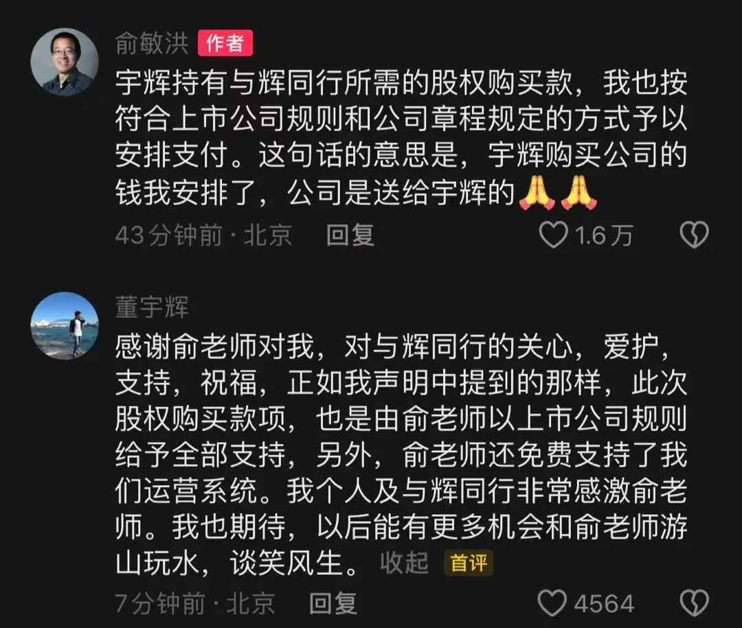 公告發(fā)出后不久,董宇輝發(fā)布社交媒體上發(fā)布《給所有朋友的一封信》稱,“考慮到現(xiàn)在的實際狀況和發(fā)展規(guī)劃,經(jīng)過雙方的友好協(xié)商和一致決定,與輝同行這家公司,之后就要開始獨立運行了。脫離了港口的庇佑,與輝同行從今天開始,就要獨自駛向遼闊海面了。未來不可預知,唯有全力以赴”。幾乎同時,俞敏洪發(fā)布《致東方甄選股東朋友的一封公開信》,向董宇輝和與輝同行送上祝福。