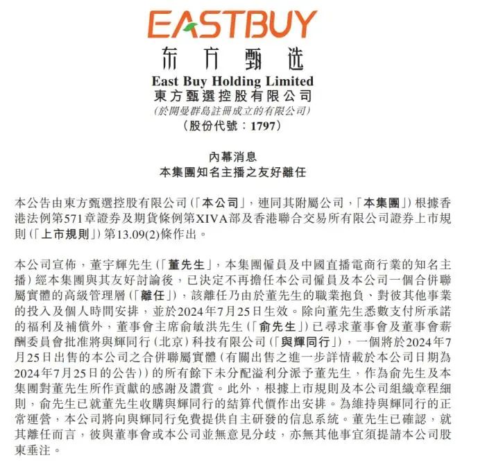 7月25日,東方甄選在港交所發(fā)布公告稱,董宇輝已從東方甄選離職,并于當日生效。
