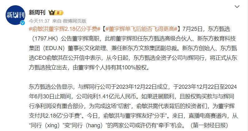 7月25日,東方甄選控股有限公司(東方甄選,01797.HK)發(fā)布公告稱,董宇輝已決定不再擔任公司雇員及公司一個合并聯(lián)屬實體的高級管理層,該離任乃由于董宇輝的職業(yè)抱負、對彼其他事業(yè)的投入及個人時間安排,于當天生效。