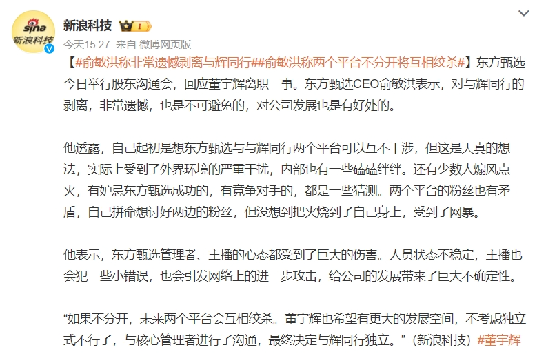 比起這份略顯冰冷的聲明,俞敏洪在自己公眾號老俞閑話寫的《致東方甄選股東朋友的一封公開信》中關于董宇輝的單飛就充滿領導者與大功臣之間充滿無奈的“BE色彩”了。
