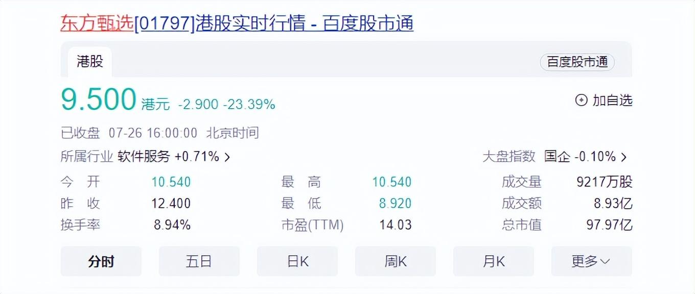 一邊是東方甄選暴跌的股價。截止到北京時間7月26日收盤,東方甄選(1797.HK)股價已經(jīng)下跌到了9.5港元/股,跌幅達到23.39%,總市值跌到了100億港幣之下。