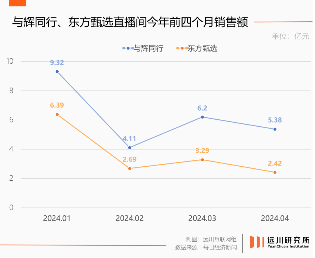 今年前四個(gè)月,主營(yíng)自營(yíng)商品的東方甄選,銷(xiāo)售額始終低于與輝同行。后者直播間以第三方品牌為主,賣(mài)的是0.01元的蝦片,11.9元的白象酸辣粉,和12元一本的《額爾古納河右岸》。